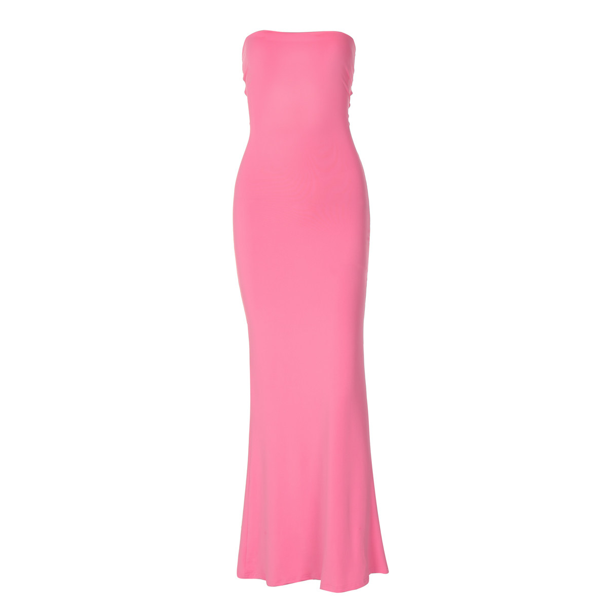 This women’s tube top dress features a European-American inspired design with a one-line collar, rope straps, and a high-waisted, slim-fitting silhouette. The stretchy fabric ensures comfort while hugging the body for a flattering figure, and the backless detail adds a subtle, sexy touch.
