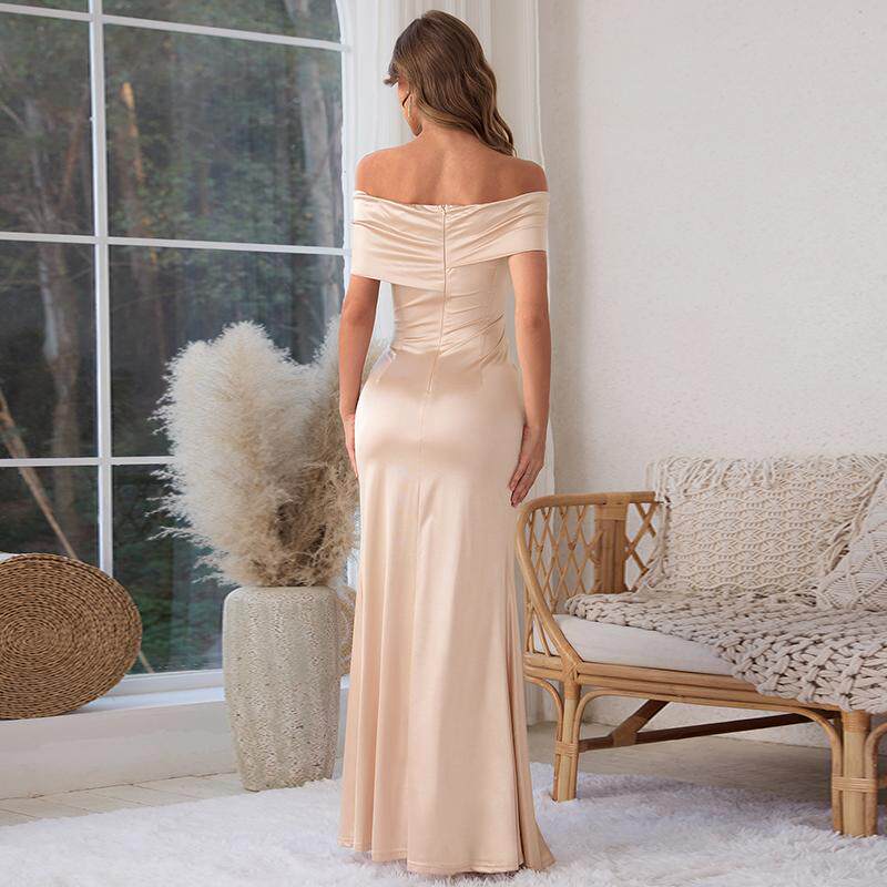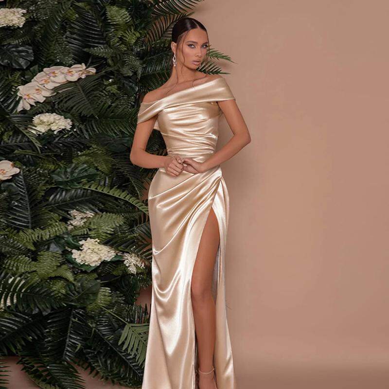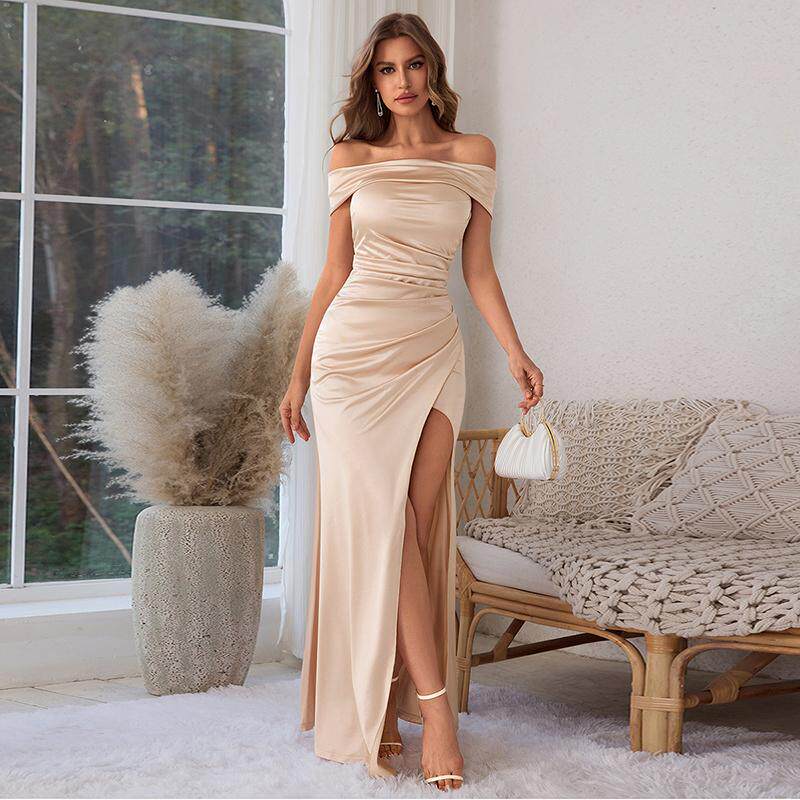 Xmzty | European-American One-Shoulder Satin Dress with Slit and Slim Long Skirt