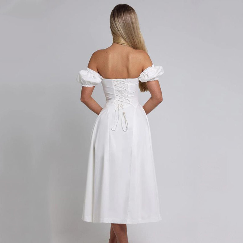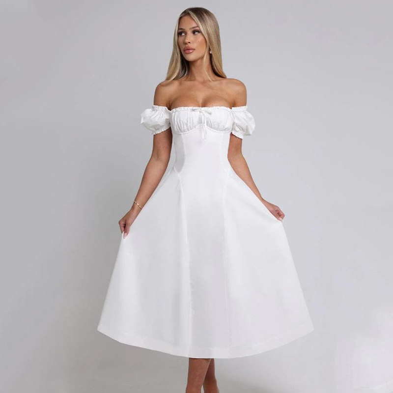 This French-inspired midi dress features a charming one-shoulder design with puff sleeves and a delicate bow detail, exuding a sweet and gentle aesthetic. The midi length and tailored waist create a flattering silhouette suitable for summer outings, holiday events, or garden parties.