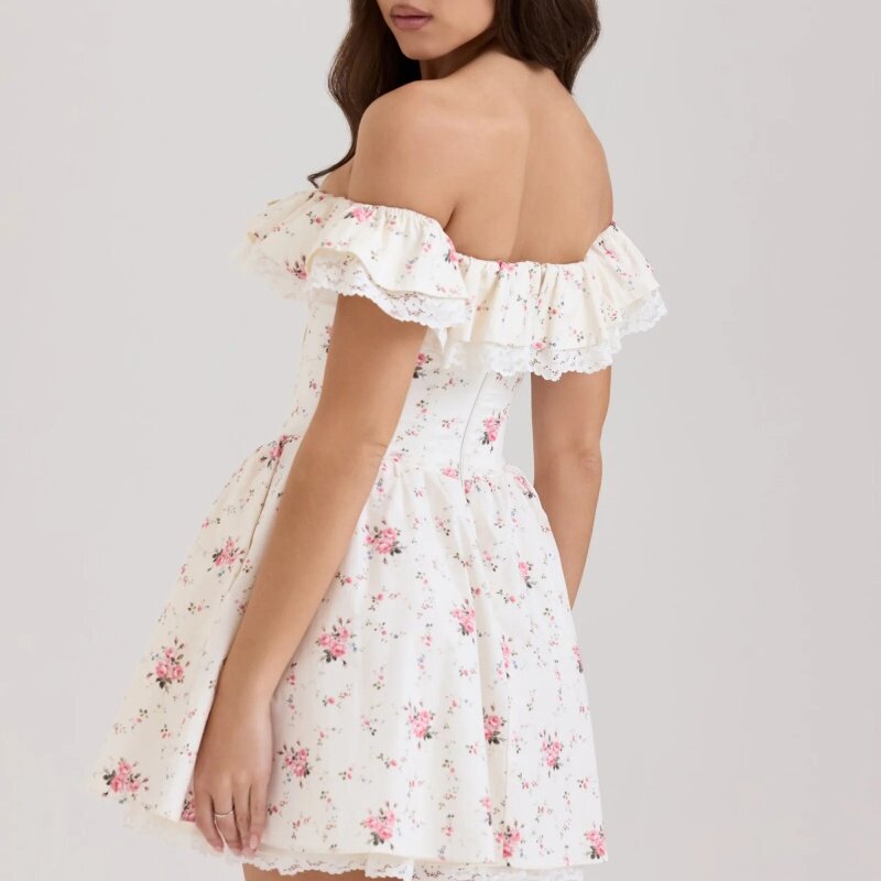 This women’s floral dress is inspired by romantic French style, featuring a soft one-shoulder design that highlights the neckline with elegance and charm. The delicate bow detail adds a sweet, youthful touch, creating a graceful princess-inspired look that feels light and feminine.