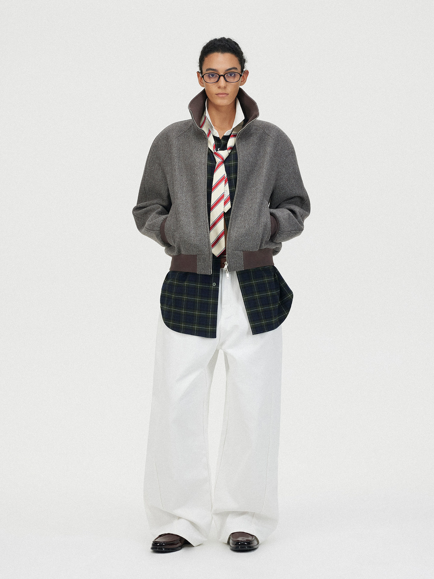 This herringbone wool jacket features a high stand collar and curved shoulder design, combining classic elegance with contemporary fashion. The textured herringbone fabric adds sophistication, while the tailored silhouette enhances the figure for a flattering fit.